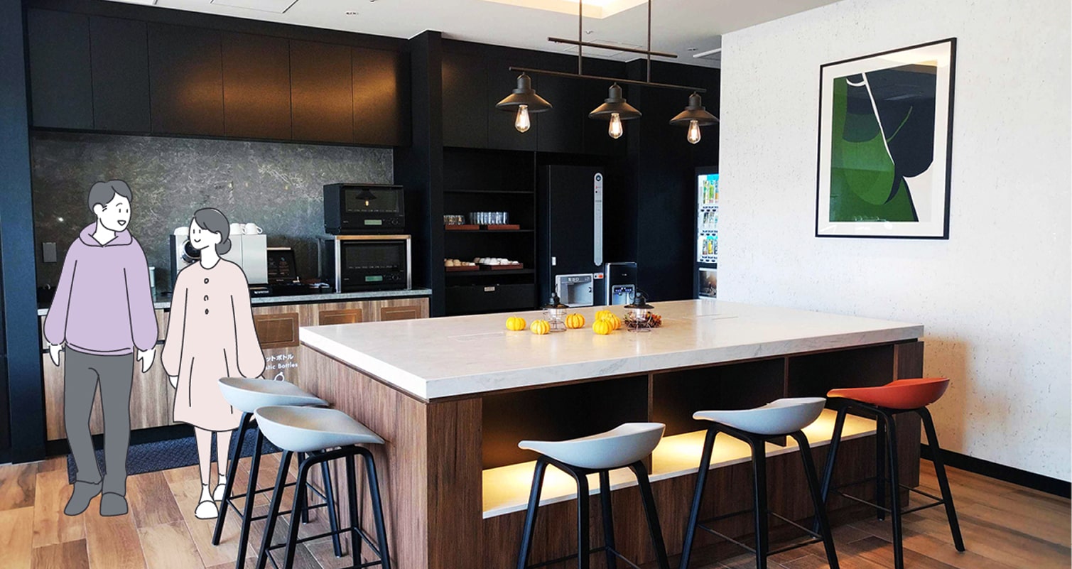※お部屋と、専用ラウンジには冷蔵庫と電子レンジお皿やカトラリーの準備がございます。飲食類のお持ち込みは自由です